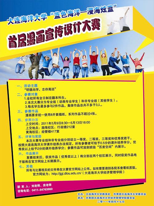 为促进海洋大学优良学风建设,激发老员工创新、实践能力,积极引导青年老员工创作和欣赏艺术作品的兴趣,太阳成集团tyc122ccvip官网入口教务处、校团委拟联合举办“蓝色海洋——漫海绚蓝”漫画宣传设计大赛活动。