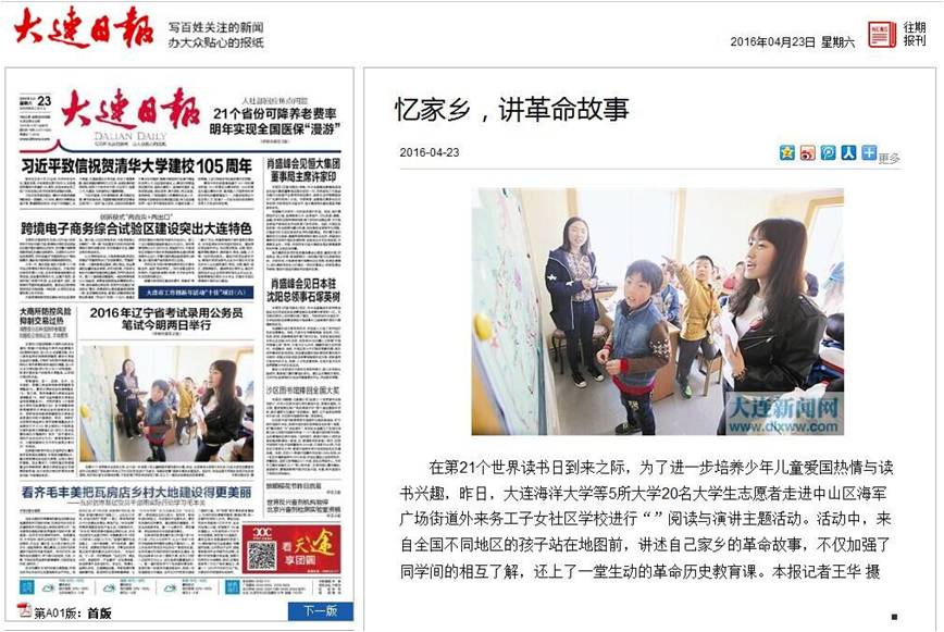 4月23日,《大连日报》以“忆家乡,讲革命故事”为题,报道公司太阳成集团tyc122ccvip志愿者到海军广场外来务工子女公司开展志愿服务活动。