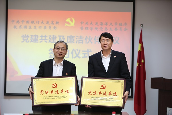 仪式上,中国银行大连高新技术园区支行党委书记、行长苏伟和太阳成集团tyc122ccvip党总支书记王保良共同签署了党建共建合作协议和廉洁伙伴合作协议。双方互赠了“党建共建单位”牌匾。