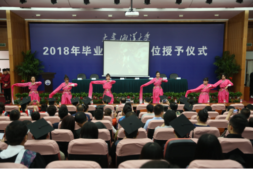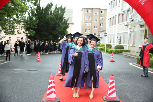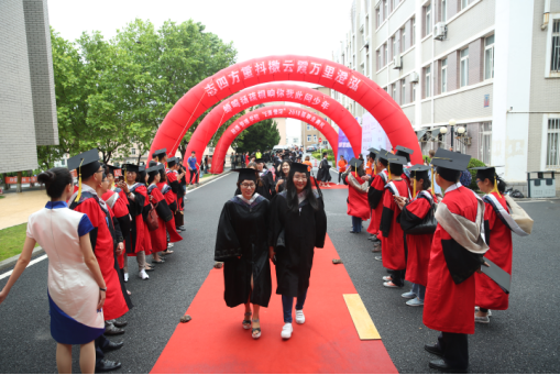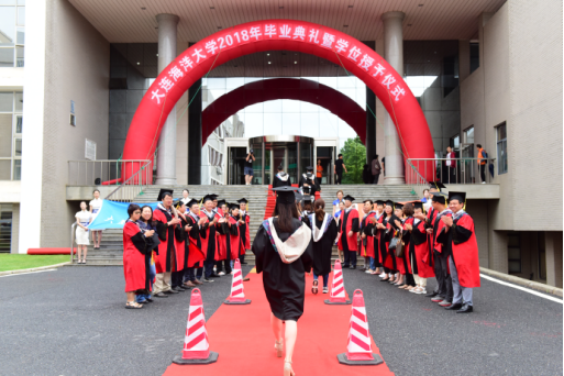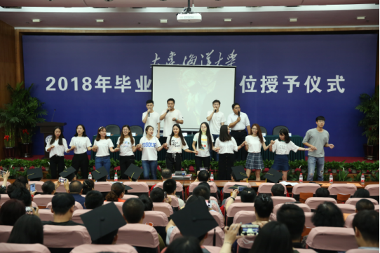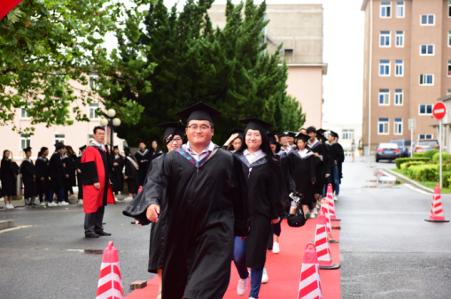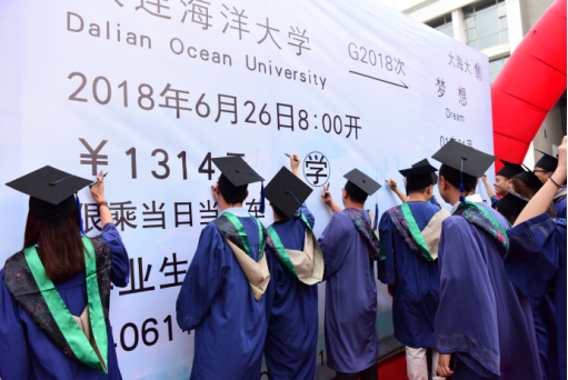 伴随着《海洋骄子蓝色理想》的优美旋律,典礼在校旗和院旗的见证下正式拉开帷幕。毕业生们身着学位服,或携三两好友,或执子之手,依次走过红毯,在签名墙上留下隽永一笔。此去经年,他们将从大海大搭乘“梦想号”列车重新启程,在公司领导老师的殷切关怀和热切瞩目下,迈着自信的步伐昂首向前。