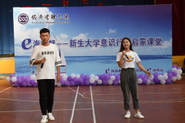 课堂由“开篇”、“热身”、“破冰”、“生活与感恩”、“深入训练”、“结课”六个部分组成。精心制作的开篇音频,带领全体新生和新生家长畅游渤海校区,对公司历史、教师风采及院系特色活动有了初步了解。伴随着2017级学长学姐热情奔放的现代舞和民族舞表演,活动正式拉开序幕。“新生采访”和“黄金掌声”环节着重培养新生的专注力和团队合作精神;幽默风趣、各具特色的“自我介绍”,不仅锻炼同学们的自我营销和自我表现力,同时增进彼此了解,活跃现场氛围。