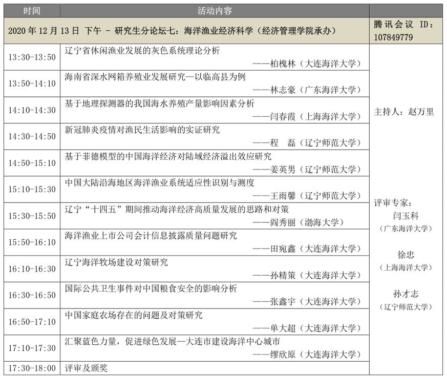 2020年12月13日召开全国海洋水产领域研究生创新与学术交流学术论坛——线上论坛