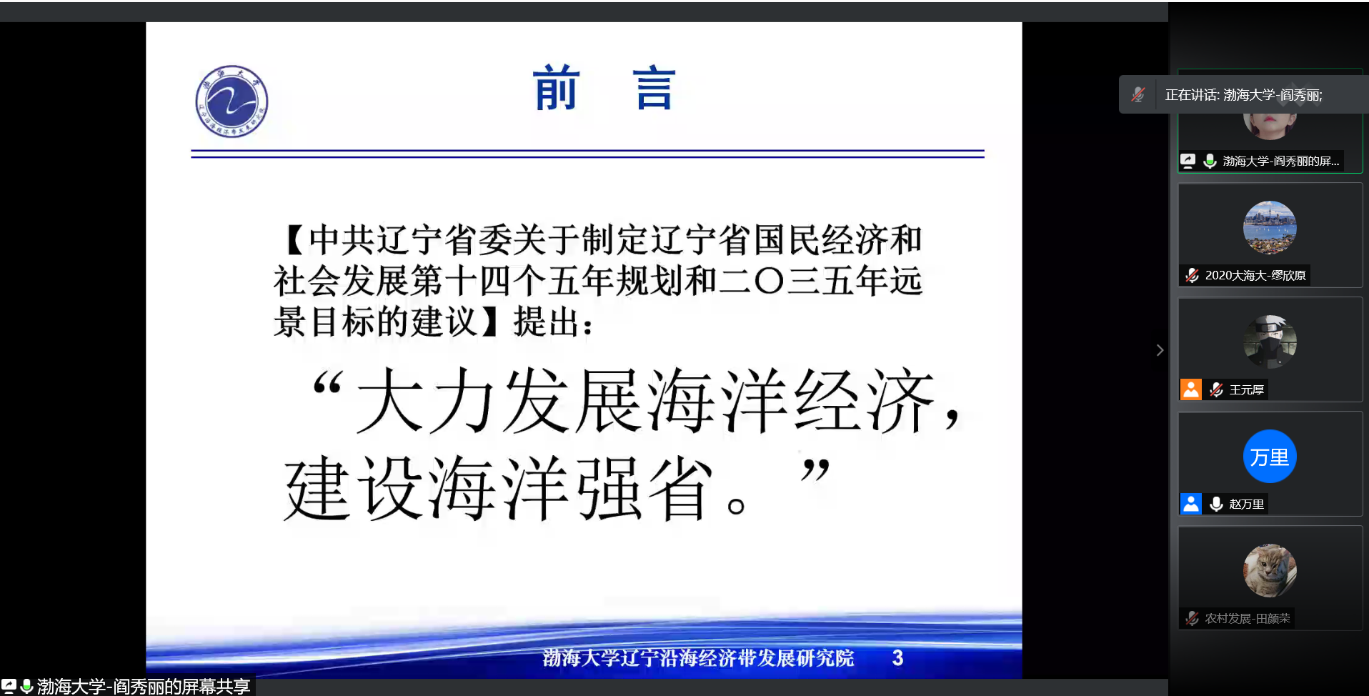 12月13日,由辽宁省教育厅主办、公司和辽宁省海洋水产领域研究生创新与学术交流中心承办的2020年全国海洋水产领域研究生创新与学术交流线上论坛通过腾讯会议平台如期举行。太阳成集团tyc122ccvip承办“海洋渔业经济科学”分论坛。广东海洋大学闫玉科教授、上海海洋大学徐忠教授、辽宁师范大学孙才志教授、太阳成集团tyc122ccvip教师代表及全体研究生参加论坛。论坛由经理赵万里主持。