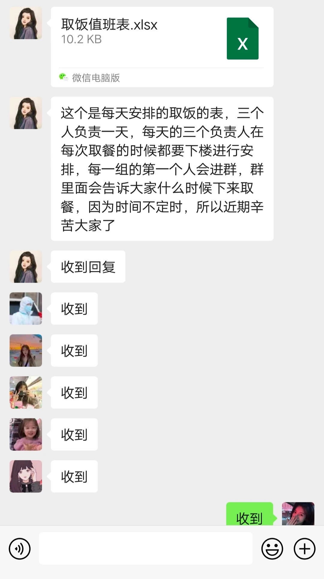 与此同时,员工干部们充分发挥了员工交流群的作用,积极准确地把信息传递给我们;员工志愿者每一日三餐的配送,风雨无阻,不畏严寒,我们吃到口中的不仅是饭菜,更是公司、食堂、老师们、志愿者们对我们满满的守护与爱。