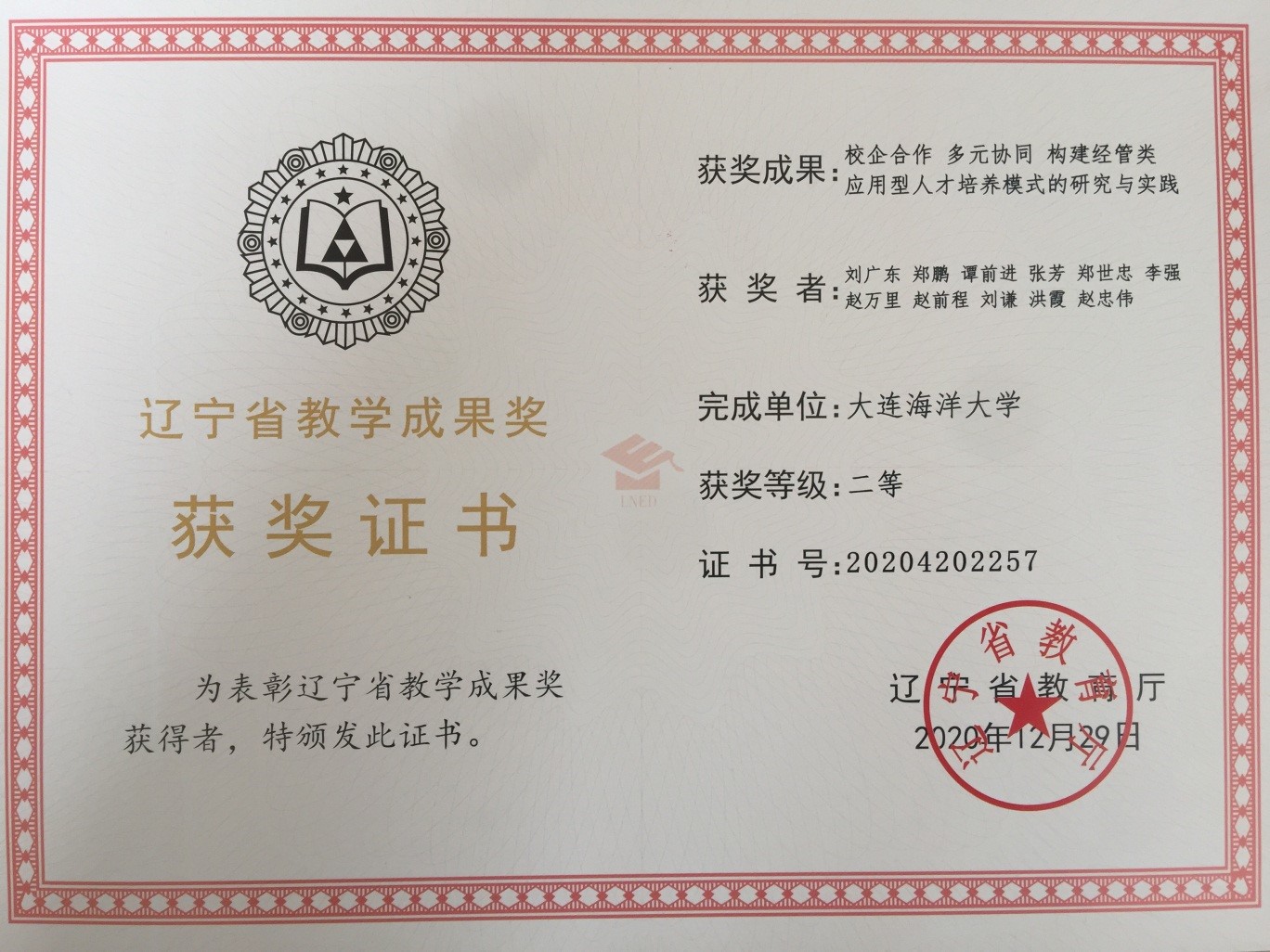 近日,辽宁省教育厅公布了《辽宁省教育厅关于公布2020年辽宁省普通高等教育(本科)教学成果奖获奖名单的通知》(辽教函〔2020〕42号),公司刘广东教授主持的《校企合作、多元协同,构建经管类应用型专业人才培养模式的研究与实践》获辽宁省教学成果二等级。