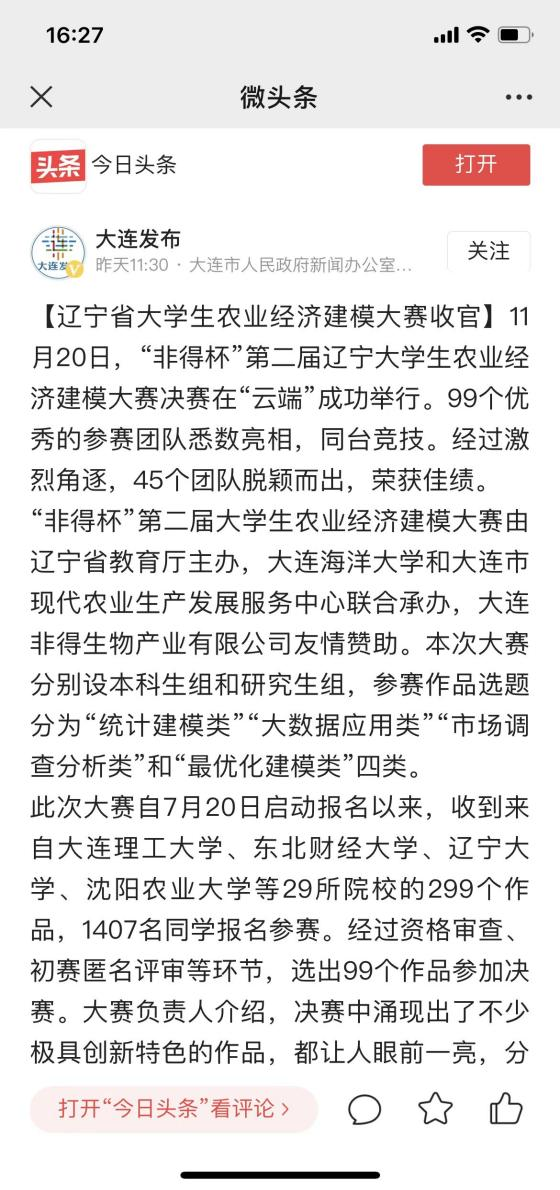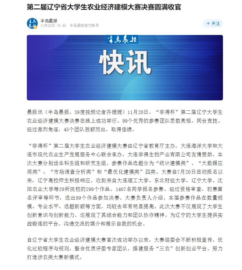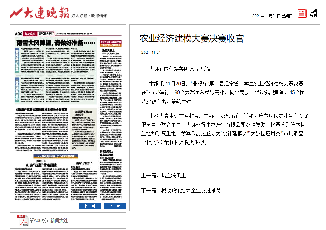 11月20日,由辽宁省教育厅主办,公司和大连市农业农村发展服务中心联合承办,大连非得生物产业有限公司赞助的第二届辽宁省老员工农业经济建模大赛决赛在“云端”成功举行。