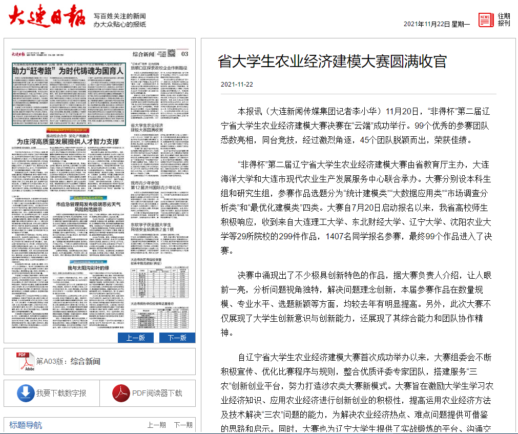 大赛自7月20日启动报名以来,省内高校师生积极响应,收到来自大连理工大学、东北大学、辽宁大学、东北财经大学、沈阳农业大学等29所高校的299个作品,1407名同学报名参赛。经过资格审查、初赛匿名评审等环节,选出99个作品参加决赛。本届参赛作品呈现出数量规模大、专业水平高、作品创新性强等特点。本次大赛也受到了媒体的广泛关注,大连日报、大连晚报、半岛晨报、大连发布、北国-辽宁日报等媒体分别以《省老员工农业经济建模大赛圆满收官》、《第二届辽宁省老员工农业经济建模大赛决赛圆满收官》、《我省29所院校299个作品聚焦“三农”发展》等为题对决赛进行了报道。