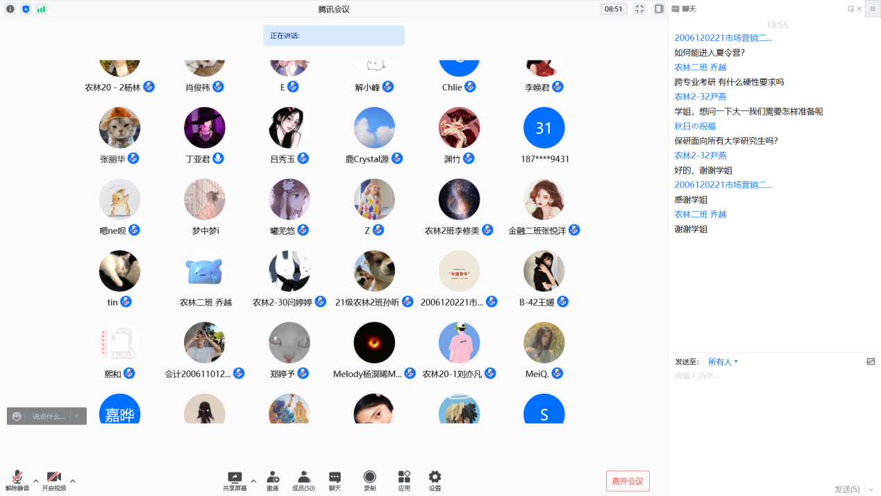 本次交流会邀请了公司本年度保研成功的4名18级员工,经济与金融专业肖俊祎、会计学专业谭兰慧、农林经济管理专业张晶格和市场营销专业丁亚君,通过线上交流会的形式为学弟学妹们进行经验分享和互动交流,公司19级、20级、21级50余名同学参加了此次交流会。