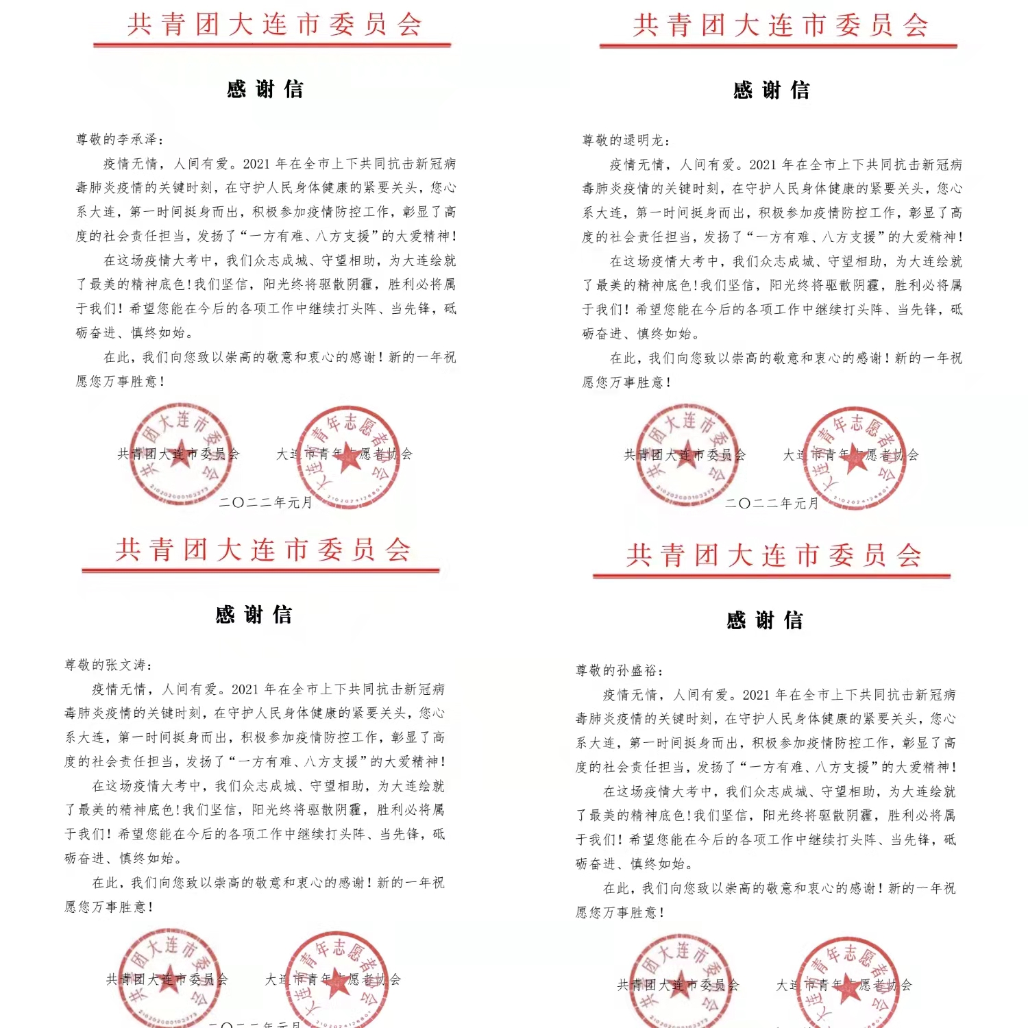 近日,大连团市委向公司发来感谢信,对公司2021级张文涛、孙盛裕、李承泽、逯明龙、艾孜买提、宋英赫六名志愿员工在2021年11月大连疫情防疫工作中作出的奉献表示感谢。