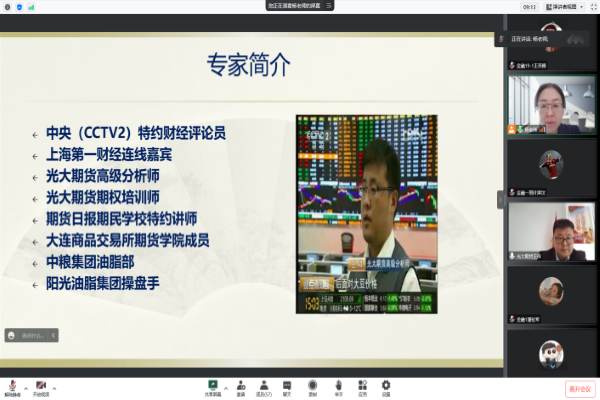 业界专家光大期货高级期货分析师王祥,具有多年金融行业及现货企业工作经验,长期从事金融产品分析和现货企业期货运营工作。公司通过线上腾讯会议的形式,邀请业界专家走进课堂。王祥分析师以《追本溯源话期货》为主题,对期货交易基本知识、中国期货业发展历程和发展概况、期货交易分析策略分别进行介绍。通过期货实盘演示,使同学们直观感受到期货市场瞬息万变的价格行情,同时指出期货从业者必备的职业素养。中国作为全球主要的大豆进口国,王祥分析师着重介绍了我国粮油企业通过期货等衍生工具开展商品套期保值业务,有效减少原材料价格波动风险的相关案例。结合其自身职业经历,为同学们的职业选择提供建议。专家讲座使员工们深刻认识到期货市场服务实体经济的重要性,对于具有中国特色的期货市场创新发展道路充满信心。