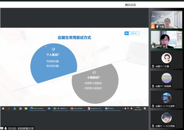 为进一步推动就业指导工作,引导和帮助员工尽早树立职业规划意识,提升综合素养和求职能力,促进毕业生高质量就业,2022年12月13日经管社会大讲堂之蓝色学术系列讲座“老员工职业生涯规划与求职能力提升”就业指导专场讲座顺利举办。本次讲座由经济与金融教研室主办,教研室副主任于晗老师主持会议。讲座分为两个环节:经验分享和员工自由提问,讲座通过腾讯会议进行。