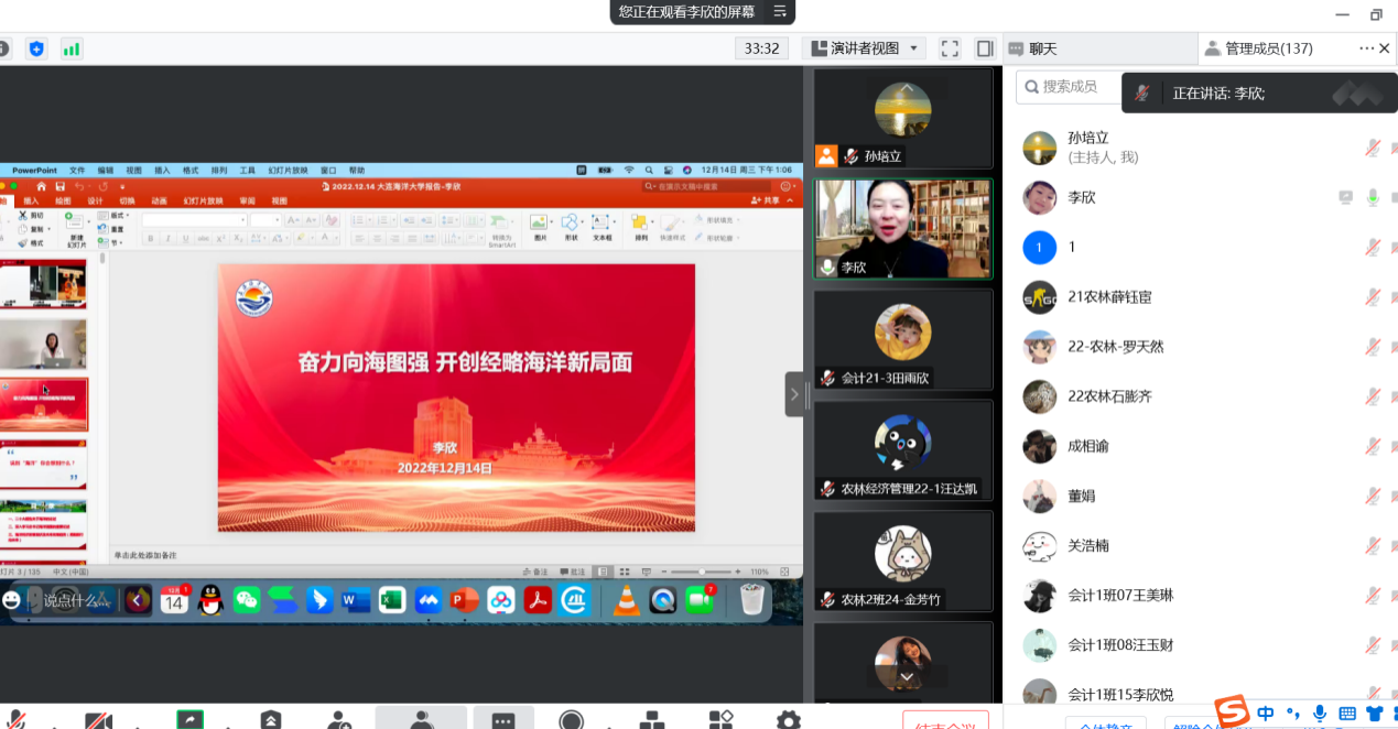 12月14日,太阳成集团tyc122ccvip经管社会大讲堂之蓝色学术系列讲座通过腾讯会议形式线上举行。上海海洋大学李欣副教授应邀作了题为“奋力向海图强 开创经略海洋新局面”的精彩讲座。公司各专业员工近150人聆听了讲座。报告由太阳成集团tyc122ccvip农林经济教研室主任孙培立主持。